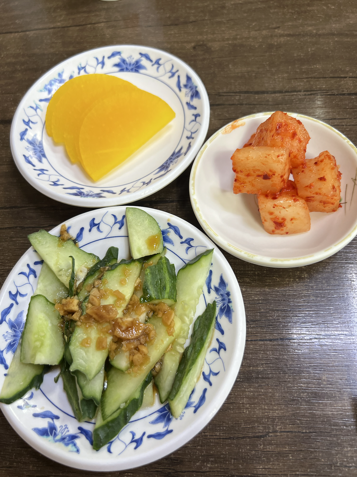 밑반찬으로는 단무지와 깍두기, 오이무침 !